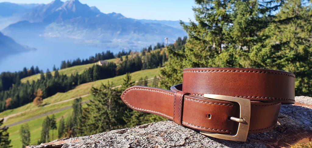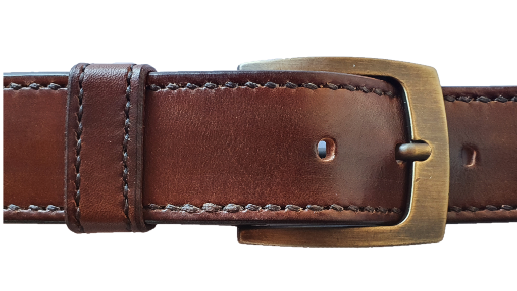 Sehr schön finde ich die Kombination aus einer Schnalle in Alt-Messing, dem nussbraunem Leder und einer schwarzen Sattlernaht.